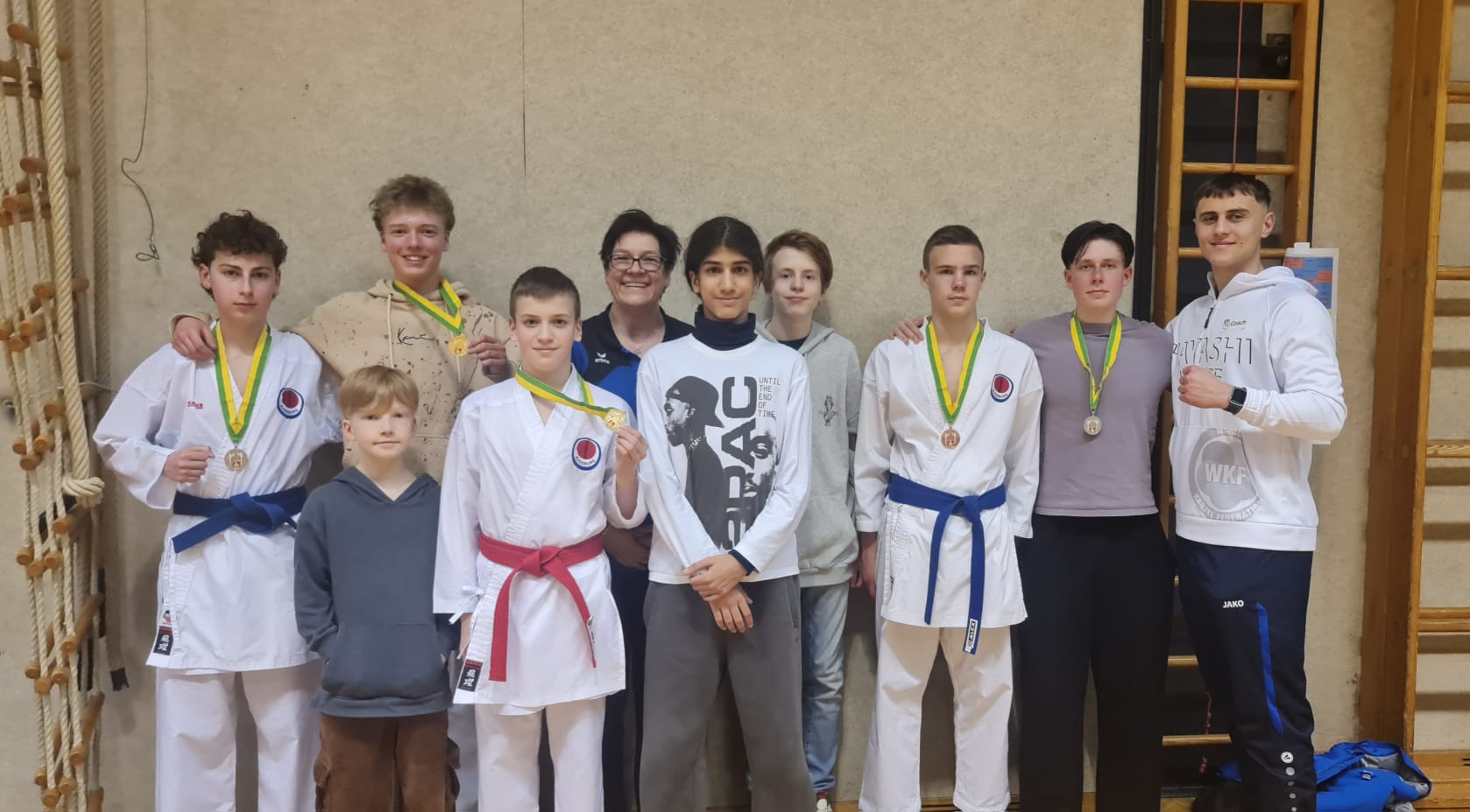 KUMITE-Athleten und Betreuer*innen des Polizei Sport Verein Augsburg e.V. beim Lions Cup 2025 (v. l. n. r.: Elias, Tobias, Jonte, Arsenij, Tanja, Presyan, Anton, Dennis, Tim, Lirant)